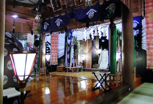 カメラは広角のまま、ゆっくりと斉主と神棚に向けます。
